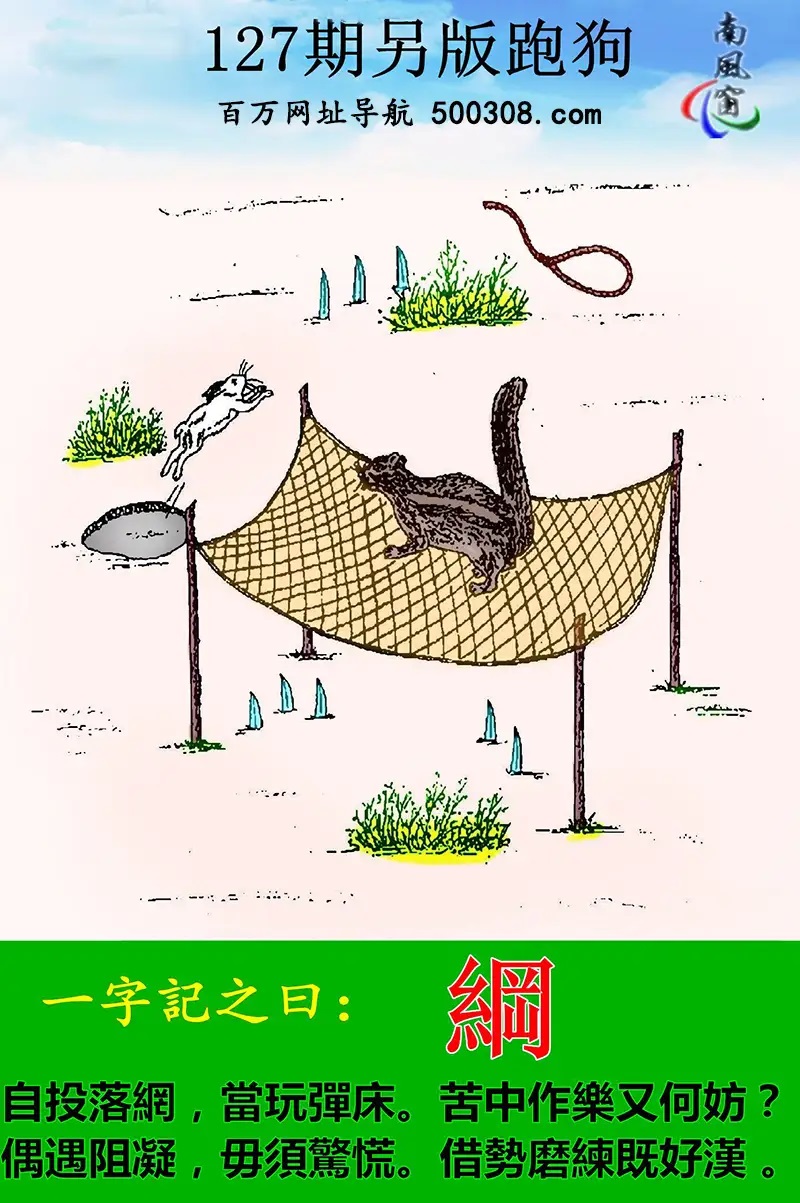 127期另版跑狗玄機圖:一字記之曰:綱自投落網,當玩彈床。苦中作樂又何妨?偶遇阻凝,毋須驚慌。借勢磨練既好漢。...